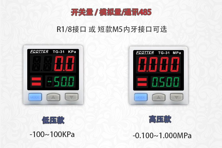 ECOTTER數(shù)顯壓力表有高壓款-0.1~1mpa 和 低壓款 -100~100kpa兩種量程不同的規(guī)格,低壓款常用于負(fù)壓檢測。這個系列產(chǎn)品有開關(guān)量、模擬量及通訊485款可選。