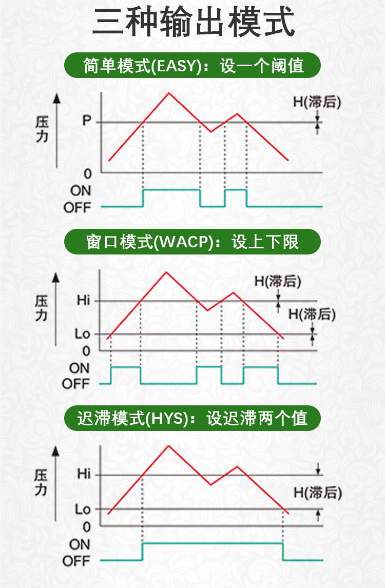 ECOTTER數(shù)顯壓力表可實(shí)現(xiàn)智能檢測,多種輸出模式,簡單模式可設(shè)置一個閥值,窗口比較模式能設(shè)上限和下限兩個閥值,進(jìn)行區(qū)間輸出。還有應(yīng)差模式,設(shè)置兩個閥值,起到遲滯的效果。