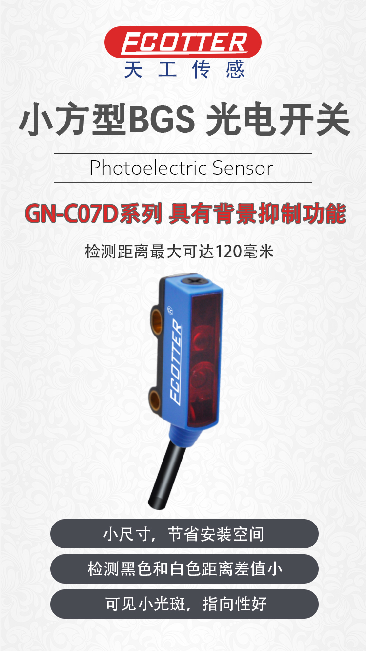 小方型光電設(shè)計尺寸小巧,可以靈活安裝在緊湊的空間內(nèi)。即裝即用的簡單使用方式往往可以提供穩(wěn)定的檢測結(jié)果。GN-C07系列光電開關(guān),采用了背景抑制原理功能更強。