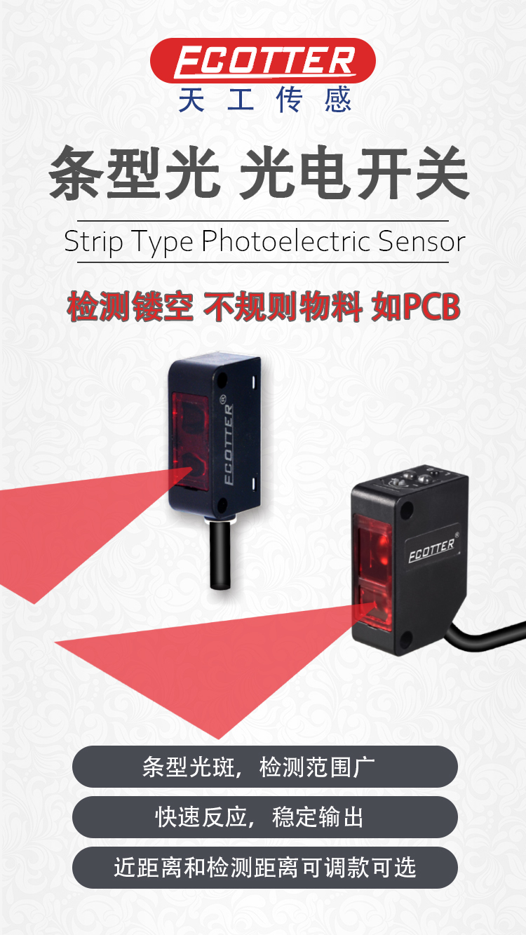 光電開關(guān)在檢測時(shí),只需要被檢測物體返回部分光就可以感應(yīng)到,而條形光光電開關(guān)的光斑是擴(kuò)散的,被檢物體的鏤空部分不會(huì)影響檢測,不規(guī)格物體滿足條件同樣可以被感應(yīng)到。