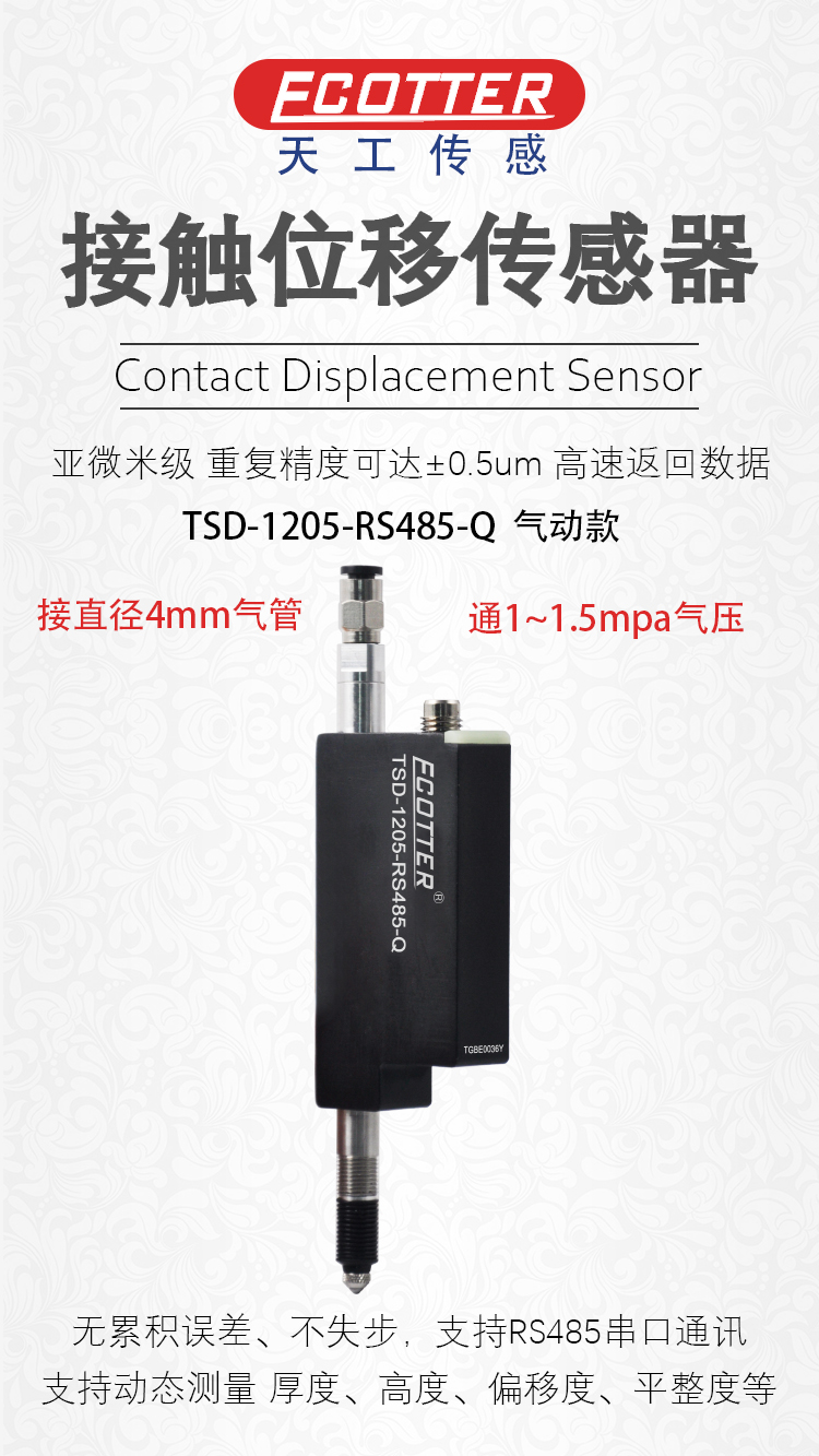 ECOTTER 氣動款 接觸位移傳感器 TSD-1205-RS485-Q 由 深圳天工 自主研發(fā),通過光學(xué)絕對值直線編碼器原理,使傳感器具備高分辨率,不產(chǎn)生累積誤差,不產(chǎn)生失步。支持串口通訊,多種量程規(guī)格可選??蓽y量厚度、距離、直徑、偏移度、平整度等。