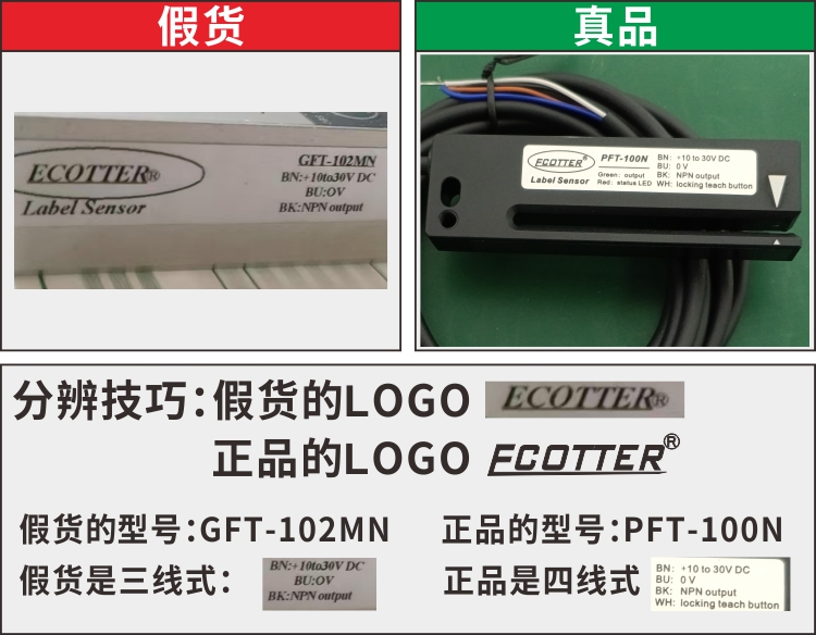 這里我們將舉例教大家分辨ECOTTER天工傳感的正品和外部冒充的假貨,讓消費(fèi)者購(gòu)買到正品,也提醒假冒產(chǎn)品制售人員立即改正錯(cuò)誤,停止不良行為。