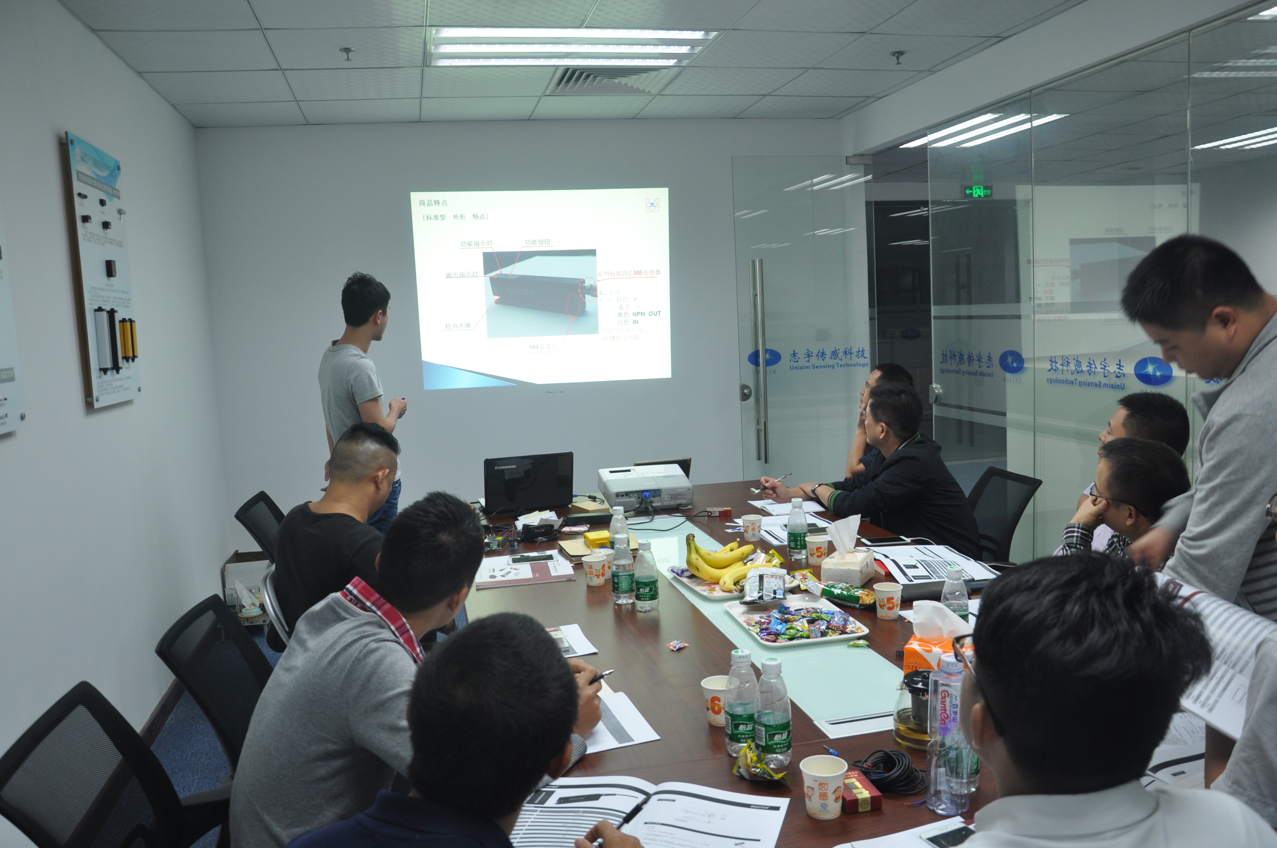 大會(huì)首先由公司總經(jīng)理?xiàng)顭ㄓ顚?duì)所有參會(huì)人員進(jìn)行了營(yíng)銷(xiāo)及公司文化方面的培訓(xùn),并由研發(fā)部的三位研發(fā)人員進(jìn)行了產(chǎn)品方面的培訓(xùn)。主要就公司三款新品:激光位移傳感器、標(biāo)簽傳感器及機(jī)器視覺(jué)進(jìn)行了全方位的講解并現(xiàn)場(chǎng)進(jìn)行功能演示。