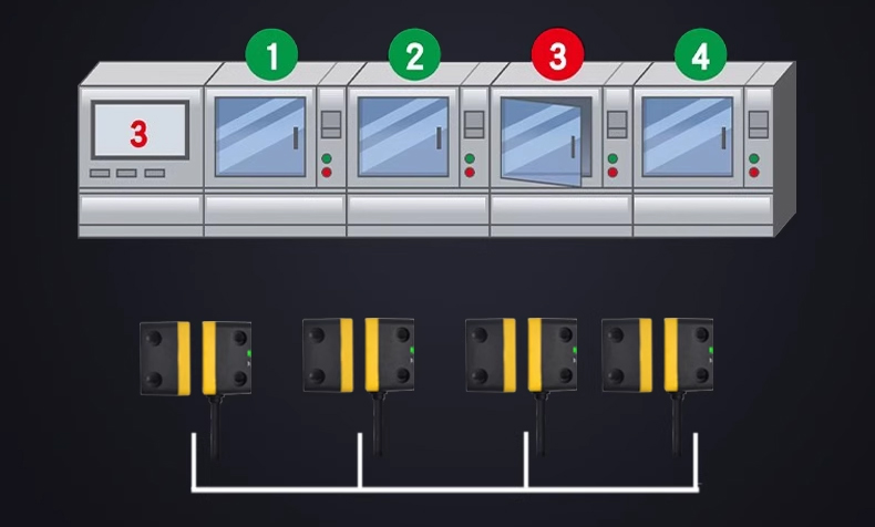多個門通過級聯(lián)連接,可實現(xiàn)統(tǒng)一的安全輸出。確認是否有其中一扇門的開閉狀態(tài)不正常。