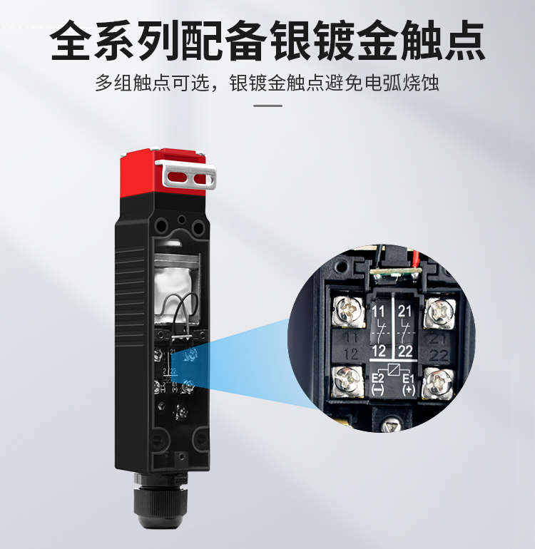 ECOTTER安全門鎖的鎖定力 強(qiáng)電磁式抗拉力強(qiáng)制鎖定力1300N以上。全系列標(biāo)配復(fù)合銀鍍金觸點(diǎn),避免電弧燒蝕,保證優(yōu)秀導(dǎo)電性能。安全門開關(guān)外殼采用PA66阻燃材質(zhì),耐高溫;電纜接頭防水;抗撞擊可選配金屬鎖頭加強(qiáng)防沖擊能力。