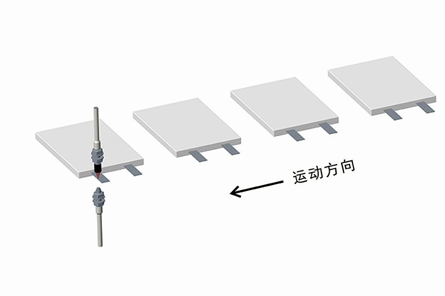 光纖放大器加對(duì)射光纖的解決方案,是在電池通過(guò)對(duì)射光束時(shí),對(duì)兩個(gè)電池極耳兩端的四個(gè)點(diǎn)進(jìn)行信號(hào)收集,從而確定電池極耳的位置以觸發(fā)焊接動(dòng)作。