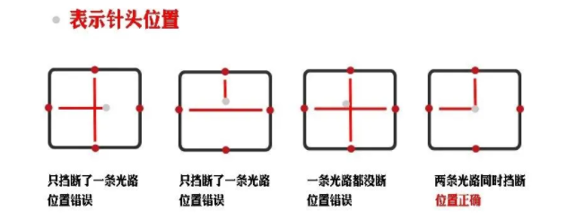 當(dāng)針嘴在檢測(cè)區(qū)域內(nèi),每次都按照相同的運(yùn)動(dòng)方向移動(dòng),每次都剛好擋斷2條光路,此時(shí)兩個(gè)傳感器同時(shí)輸出信號(hào),可以判斷針嘴在正確的水平位置,實(shí)現(xiàn)XY軸對(duì)針效果。
