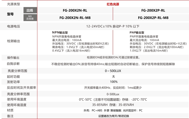 ECOTTER 外來光源檢測(cè)光纖傳感器 FG-200X2N-RL 可以對(duì)所有光源進(jìn)行檢測(cè),而不僅僅是對(duì)傳感器自身發(fā)出的光進(jìn)行檢測(cè),在工業(yè)自動(dòng)化的應(yīng)用中,可以檢測(cè)手機(jī)屏是否正常亮起,電子產(chǎn)品的指示燈是否正常等檢測(cè)。